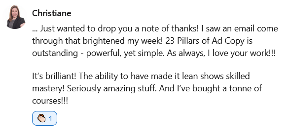 Revealed inside the 23 Pillars of exceptional ad copy - before and after, real-world examples and ChatGPT prompts to automate the process for you.
